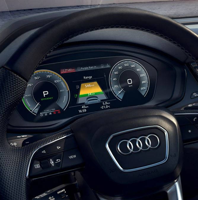 L’indicateur de puissance, situé à gauche du tableau de bord numérique, Audi Virtual Cockpit (de série ou en option), affiche la puissance totale du système, le mode de conduite et l’état de charge de la batterie. Au centre, vous pouvez voir l’autonomie restante divisée entre le moteur électrique et le moteur thermique. Vous pouvez également utiliser votre smartphone avec l’application myAudi à tout moment pour avoir un aperçu de l’autonomie du véhicule.