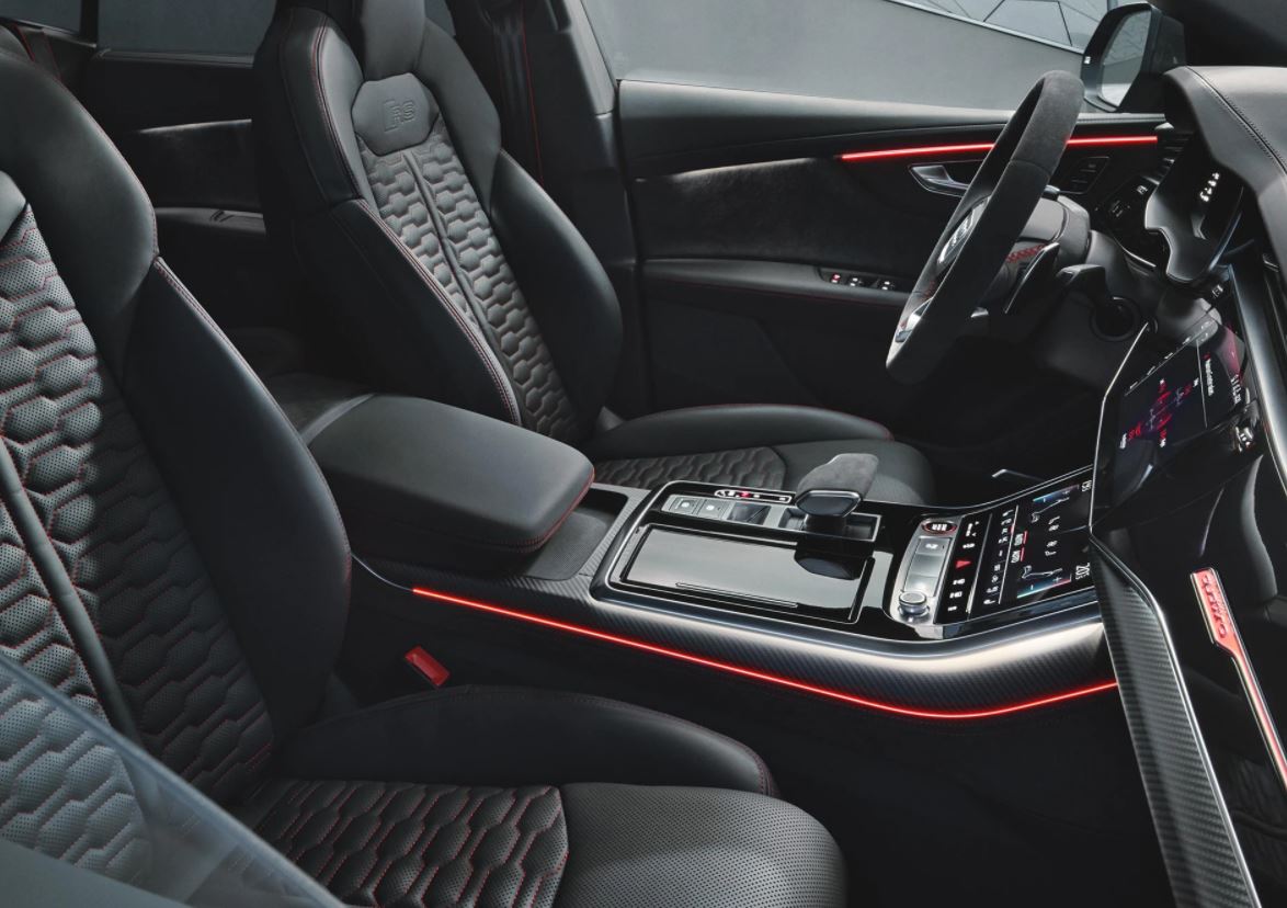 L’habitacle de l’Audi RS Q8, tout en horizontalité, vous offre une grande sensation d’espace. Outre un parfait maintien latéral, les sièges Sport ‘’RS’’ arborent une superbe sellerie en cuir Valcona perforé avec surpiqûres en nid d’abeille. Et pour personnaliser un peu plus votre SUV Coupé Audi Sport, jusque dans les moindres détails, des packs qui intègrent des surpiqûres contrastées du plus bel effet sont proposés. En supplément, la console centrale est nichée dans un écrin à la finition sportive avec du carbone mat.