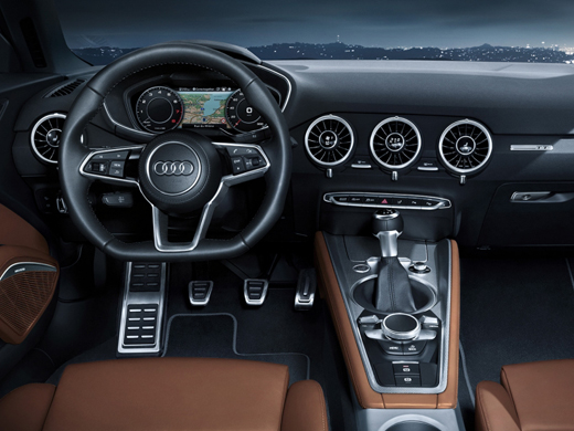 Ce bolide souligné par un arrière galbé, des lignes tendues et pure et surtout reconnaissable entre mille par son profil athlétique inspiré d’un modèle sorti en 1998. Le constructeur a atteint la perfection avec ce modèle qui, du point de vue extérieur, est d’une beauté à couper le souffle. Les phares Audi Matrix LED, en option, ou Xenon plus de série rendent en effet la TT coupé plus dynamique. Ce qui complète parfaitement avec sa face avant plus sportive que jamais avec une nouvelle calandre Singleframe plus angulaire. Autres détails, les 4 anneaux qui constituent l’identité de la marque seront dorénavant apposés sur le capot. A l’intérieur, l’habitacle épuré et sportif de la TT Coupé témoigne du goût pour le luxe et le confort d’Audi. Surprenant, les buses d’aération de ce véhicule, en forme de turbine, et sa planche de bord aux lignes anguleuses, présentent une forte ressemblance avec l’aile d’avion. Entièrement digital, le tableau de bord embarque un écran haute résolution de 12,3 pouces pour un accès facile aux informations nécessaires pour la route.