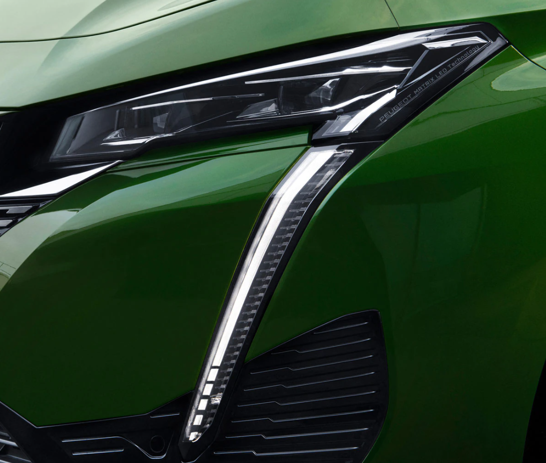 La signature lumineuse avant ultra compacte est résolument actuelle et technologique. Les projecteurs avant signent la dynamique et l’identité de la Nouvelle Peugeot 308. Ciselés et fins, ils bénéficient de la technologie LED ou Peugeot Matrix LED Technology et sont prolongés de DRL en forme de crocs sur le bouclier avant.