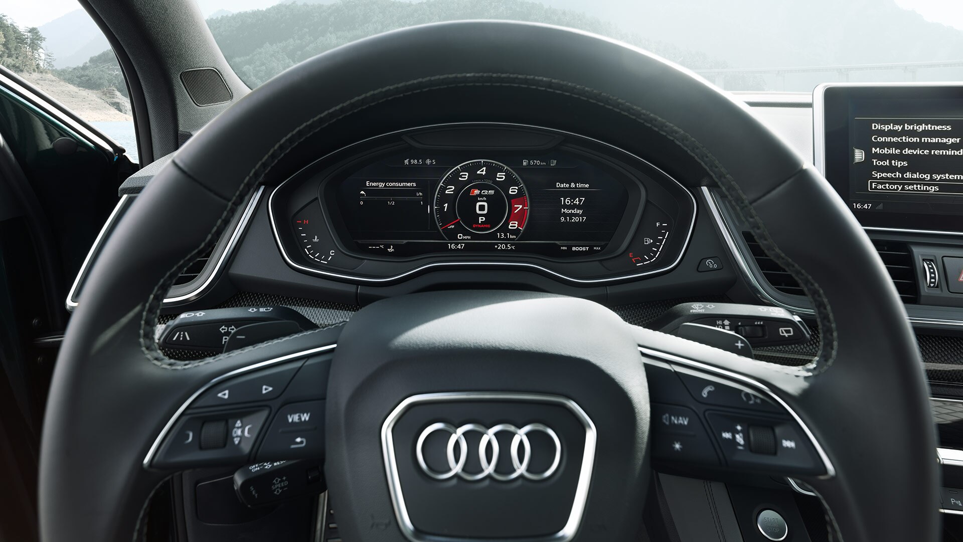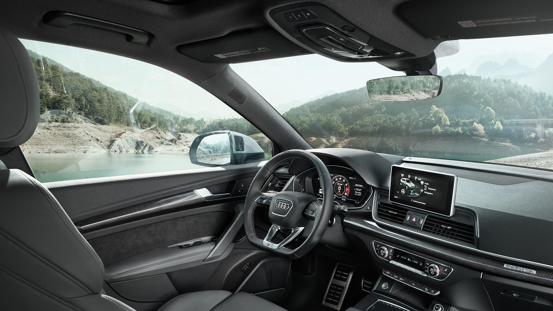 À bord de l’Audi SQ5 TDI, vous disposez de technologies qui simplifient vos trajets. Disponible de série, l’Audi virtual cockpit, tableau de bord digital, affiche en HD toutes les informations essentielles telles que la vitesse, le régime moteur… mais également, sur votre demande, les fonctions de navigation, communication et d’infodivertissement. Inclus de série, les services Audi connect vous offrent de nombreuses fonctionnalités et vous permettent de profiter d’Internet pendant vos voyages. L’affichage tête haute, disponible en option, affiche directement dans votre champ de vision la vitesse, ainsi que les informations des systèmes d’assistance et de navigation afin que vous ne quittiez jamais la route des yeux.