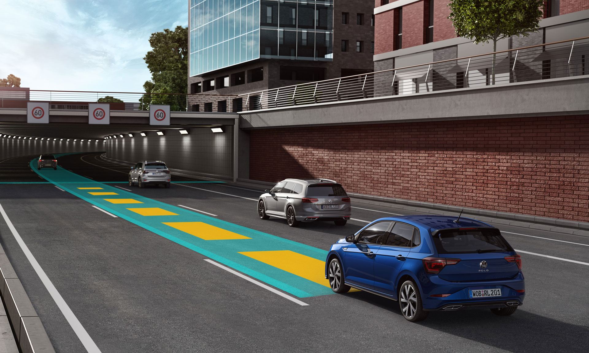 Le régulateur de vitesse adaptatif (ACC)* en option peut vous aider à respecter votre vitesse maximale prédéfinie (jusqu’à 210 km/h) et à maintenir la distance avec le véhicule qui vous précède2. Il permet également à votre Nouvelle Polo de s’arrêter et de repartir automatiquement dans les embouteillages (uniquement avec la boîte de vitesses automatique DSG). Le régulateur de vitesse prédictif et l’assistant de virage sont ajoutés à l’ACC en combinaison avec le système de navigation en option**. Cela vous permet d’éviter de dépasser les limitations de vitesse en identifiant les limites officielles le long de votre itinéraire2 .Le système utilise également les données d’itinéraire du système de navigation pour adapter la vitesse du véhicule dans les virages, les ronds-points et aux jonctions (sorties)2.