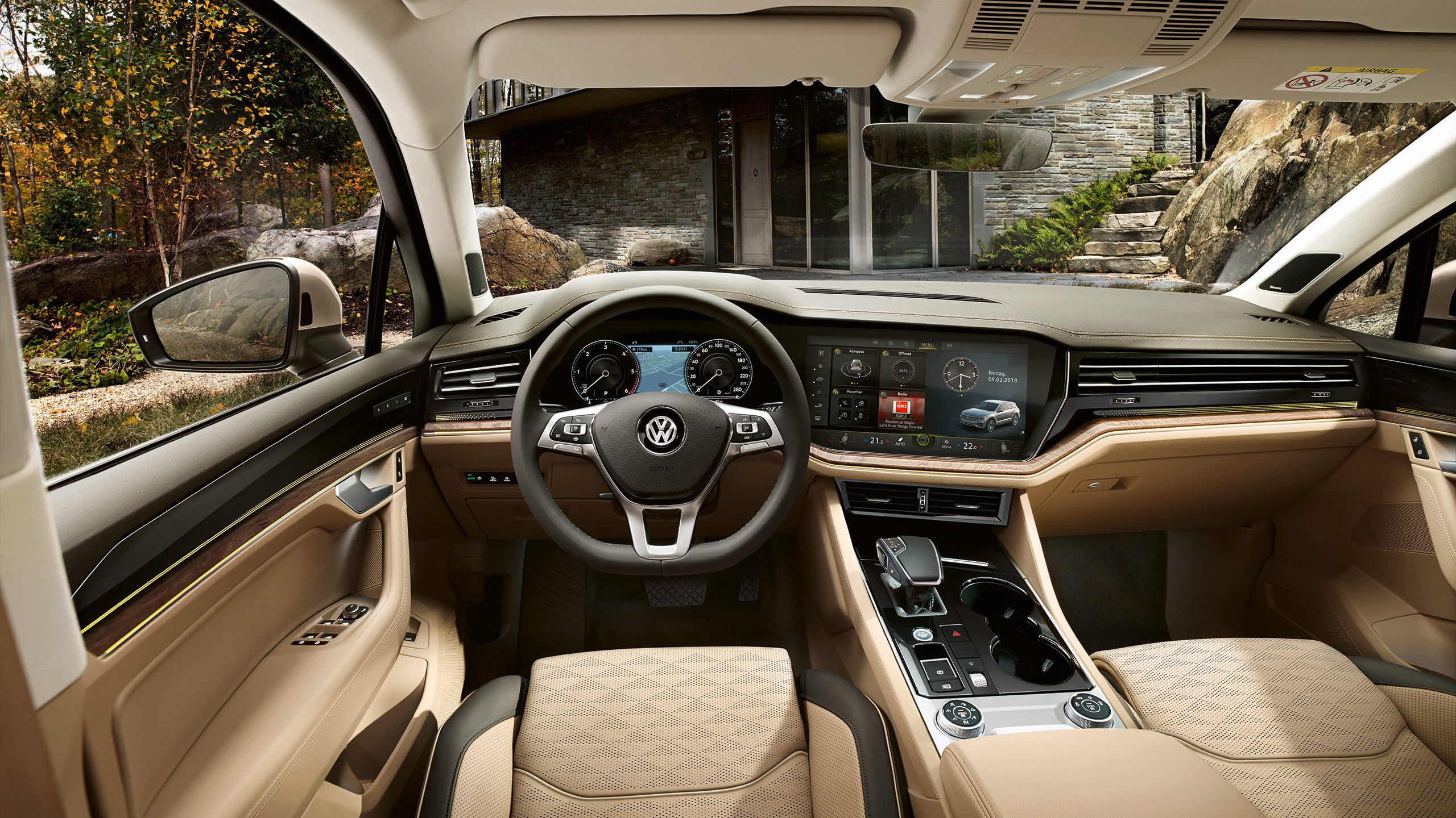 Le design ultra-moderne de l’intérieur du Touareg fait rêver avec des matériaux naturels. La finition bois épurée « Sapele Mahogany » éblouira les plus exigeants tandis que le cuir Bonaza Brown embaumera l’intérieur d’un subtil arôme épicé. La nouvelle couleur d’habillage « St Tropez » apaisera le cœur des passagers et l’éclairage blanc des éléments de commandes va ravir le conducteur. Encore une fois, c’est dans l’option R-Line qu’il faut chercher pour perfectionner l’intérieur de la Volkswagen Touareg. Celle-ci propose en effet des détails intéressants, entre autres, des sièges sport R-Lines à 14 modes de réglage ou encore le volant multifonction gainé de cuir. Pour le confort de conduite, cette gamme embarque plusieurs équipements dédiés au confort et à la sécurité des passagers dont Active Lighting system, ACC avec « Front Assist », Area View ainsi que les systèmes d’assistance « Lane Assist » et Side Assist ». En matière d’infotainement, le Touareg promet encore une fois une totale satisfaction grâce notamment à son système de navigation « RNS 850 », une véritable prouesse technologique.